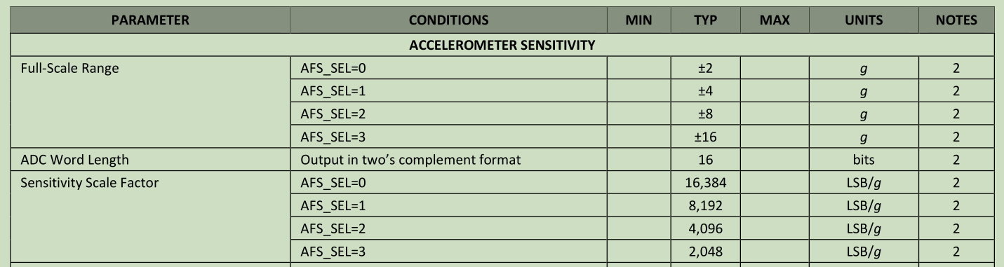 可以看到,我将加速度计的量程设置为了±4g,下面是从数据手册中截取的图形,从图中可以看到加速度计量程±4g对应的精度是8192。