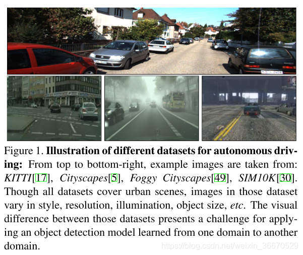 在计算机视觉中目标检测是一个基本的问题,目的是在一幅图像中识别和定位确定类别的所有目标实例。受CNN大潮的驱动,许多基于CNN的目标检测方法开始出现,很大程度上提升了,目标检测的性能。尽管在基准数据集上取得了非常好的性能,但是真实世界的目标检测依然面临着很多方面的变化,目标外观、背景、亮度、图像质量等,在训练和测试集上面临着相当大的域迁移。以自动驾驶为例,在一个特定汽车上使用的相机类型和设置也许和收集到的训练数据不同,汽车也许在一个不同的城市,目标的外观也是不同的。更重要的是自动驾驶期望在不同天气条件下可靠的工作(例如,在雨或雾中),但是训练数据通常在能见度比较高的干燥天气中获得。