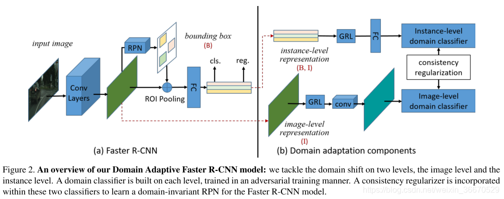 为了解决域漂移,我们在图像级和实例级上合并两个域适配组件到Faster R-CNN,来最小化两个域的H散度差别。在每个组件上我们训练一个域分类器,并且采用对抗策略来学习域不变鲁棒特征。