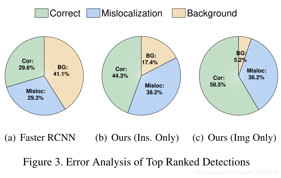 结果如图3所示。从图中我们可以观察到,每个单独的组件(图像级或实例级适配)都提高了正确检测的数量(蓝色),并显著减少了误报的数量(其他颜色)。此外,我们还观察到使用实例级对齐的模型比使用图像级对齐的模型具有更高的背景误差。原因可能是图像级对齐更直接地改进了RPN,从而产生了具有更好定位性能的区域建议。