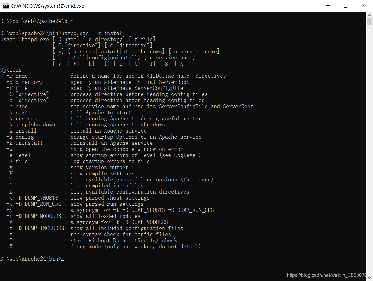 - 用cmd命令进入Apache目录下的bin目录,(cmd常用命令d:是进入d盘 cd web\Apache24\bin 是进入指定目录)进入之后 输入httpd.exe – k install进行安装