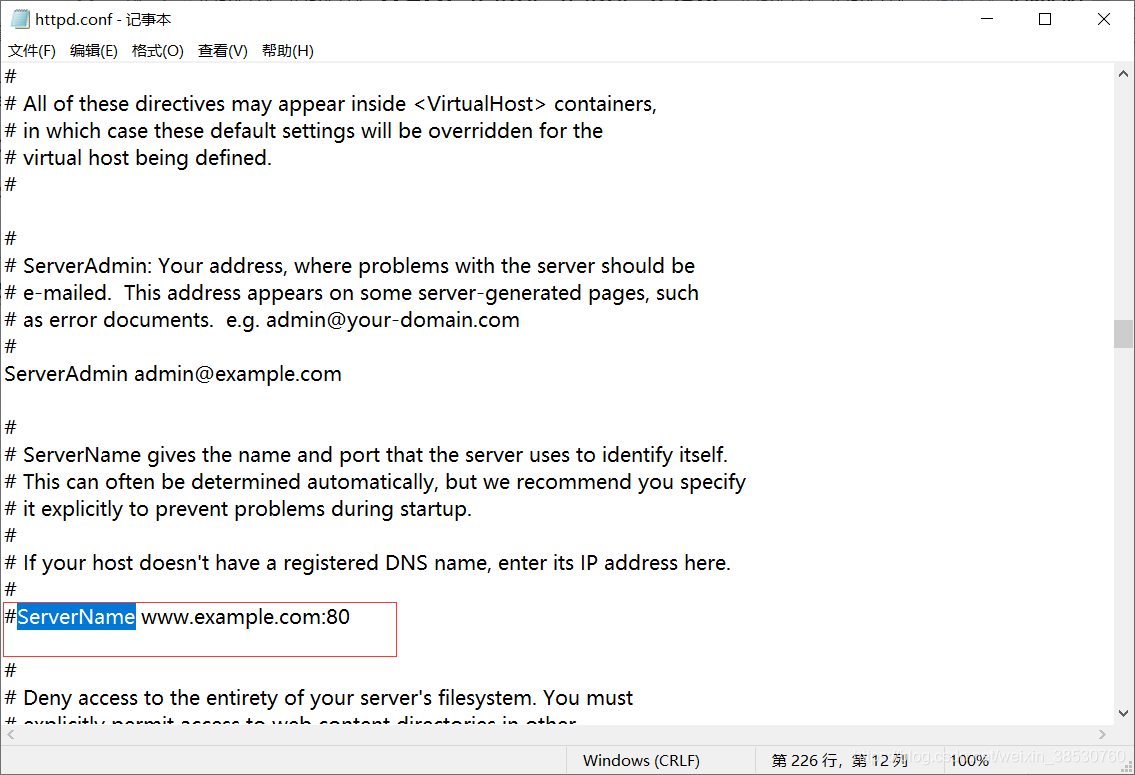 首先找到ServerName(约213行),将其设置为localhost:80,并将前面的井号删除,虽然这一步如果不修改的话也可以正常运行,但启动Apache服务时会有一条烦人的提示(AH00558: httpd.exe: Could not reliably determine the server’s fully qualified do main name, using fe80::fc76:abca:e24b:d490. Set the ‘ServerName’ directive globally to suppress this message),