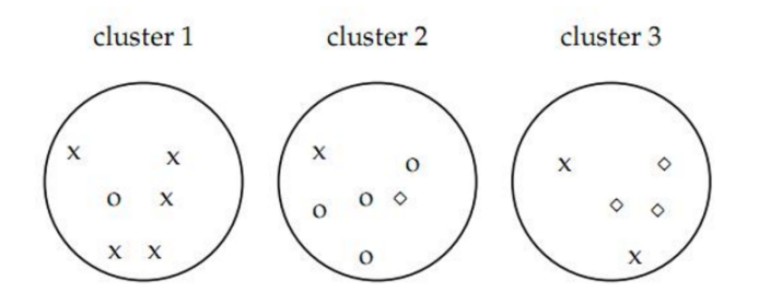 其中,参数m表示整个聚类划分涉及的成员个数;聚类i的纯度定义为Pi;K表示聚类的类簇数目。举个示例,假设聚类成3堆,其中x表示一类数据集,o表示一类数据集,◇表示一类数据集,如图4所示。