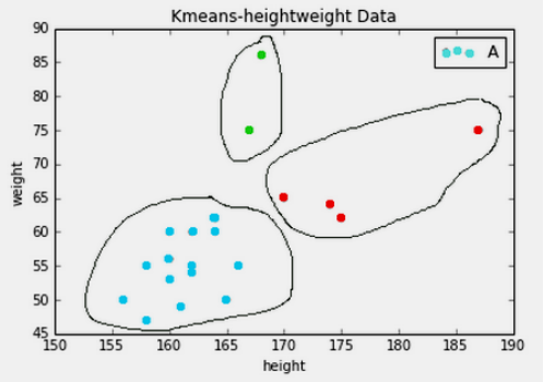 图5是对身高和体重进行聚类的算法,将数据集的人群聚集成三类。