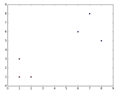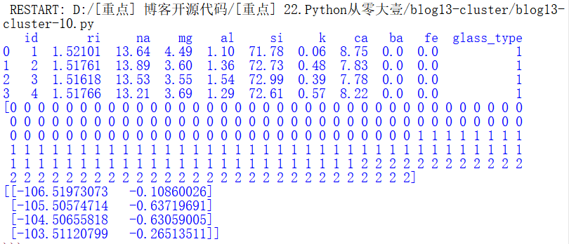 上述代码调用Birch算法聚成两类,并对X数据进行训练,共6个点(1、2、3、4、3、2),然后预测其聚类后的类标,输出为0或1两类结果,其中点1、2、2输出类标为1,点3、4、3输出类标为0。这是一个较好的聚类结果,因为值较大的点(3、4)聚集为一类,值较小的点(1、2)聚集为另一类。这里只是进行了简单描述,后面将讲述具体的算法及实例。