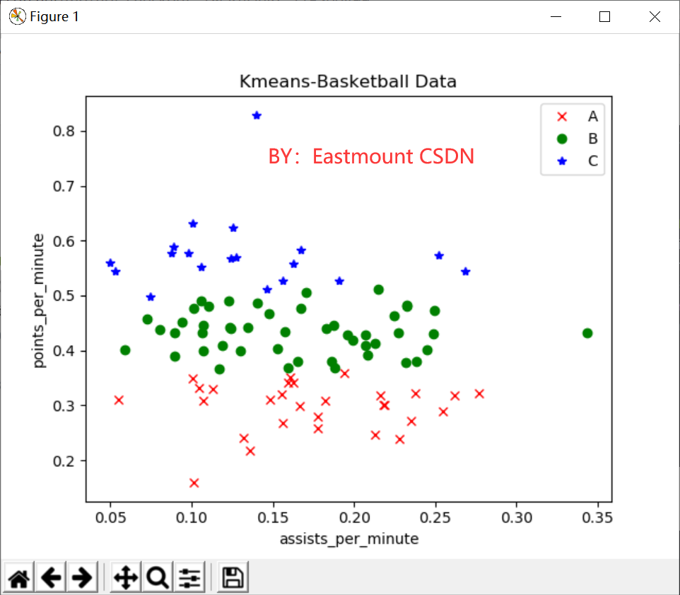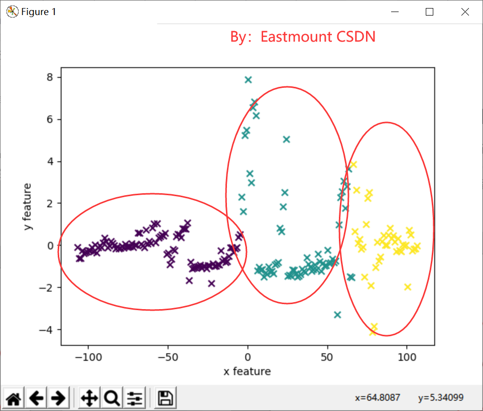 K-Means聚类算法最早起源于信号处理,是一种最经典的聚类分析方法。它是一种自下而上的聚类方法,采用划分法实现,其优点是简单、速度快;缺点是必须提供聚类的数目,并且聚类结果与初始中心的选择有关,若不知道样本集要聚成多少个类别,则无法使用K-Means算法。Sklearn包中调用方法如下: