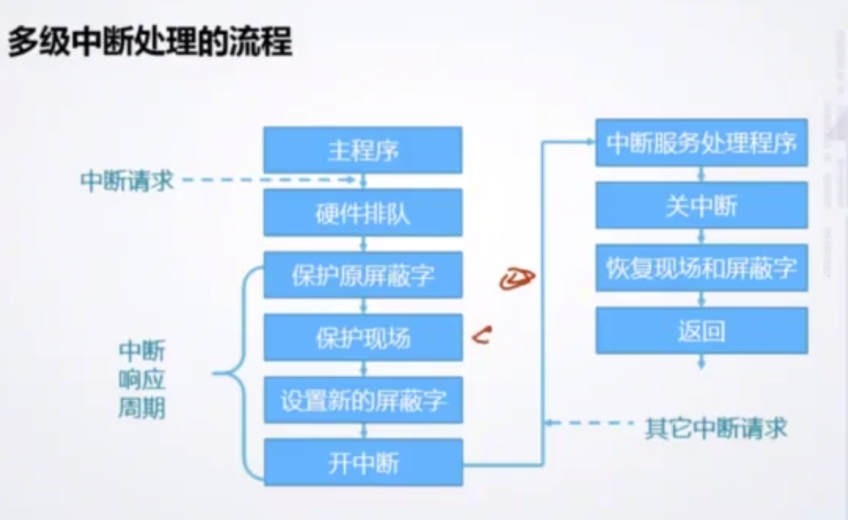 软件服务优先序;在各中断服务程序开头,用软件设置自己的中断屏蔽字,以此改委实际服务顺序。中断的处理: