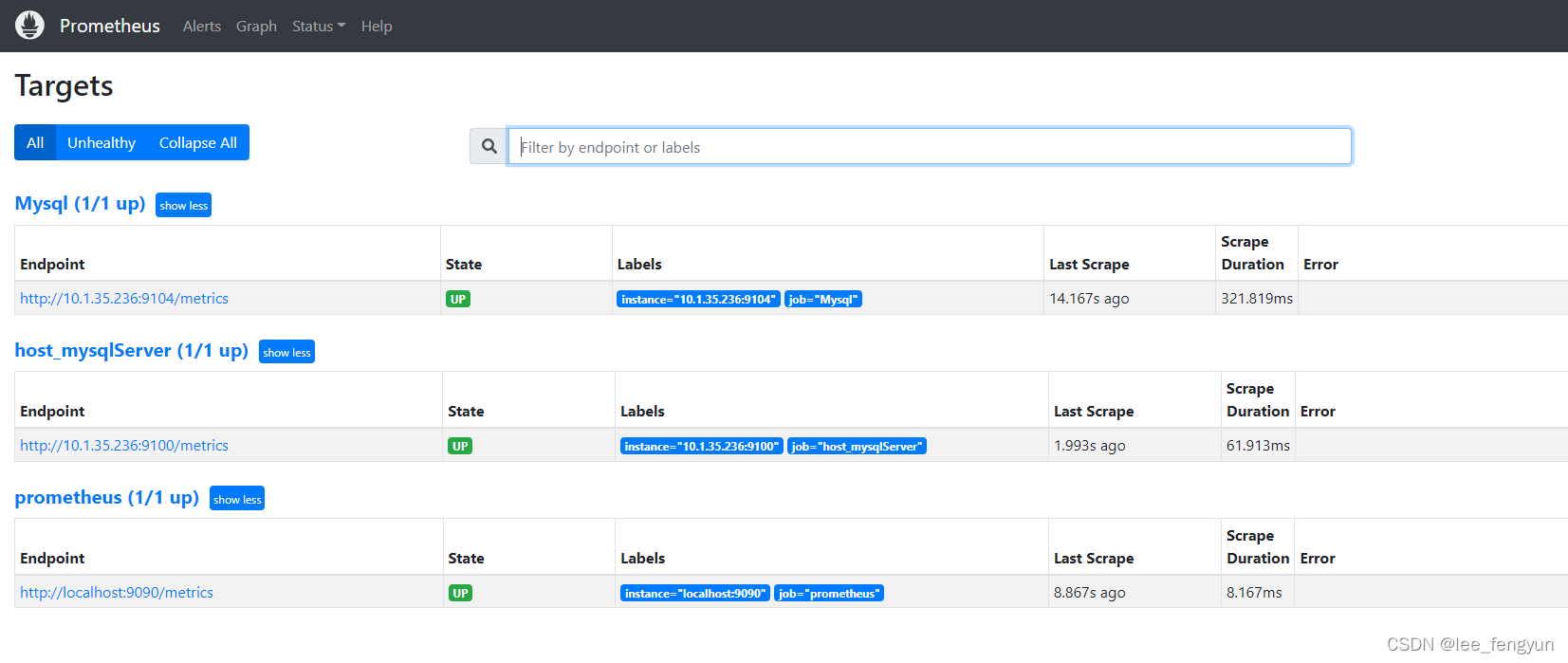 回到web管理界面(http://服务器IP:9090) –》点Status –》点Targets –》可以看到多了一台监 控目标