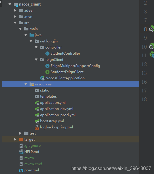 12.然后新建一个nacos_client项目 其项目的application.yml、bootstrap.yml、application-dev.yml 、application-prod.yml、logback-spring.xml 、pom.xml 启动类等与nacos_server一样 新建一个feign调用的FeignMultipartSupportConfig、主要解决跨服务调用多文件上传 入用不到可忽略: