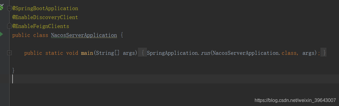 3.nacos_server项目启动类引入以下两个注解:@EnableDiscoveryClient(注册中心注册发现)、@EnableFeignClients(feign客户端调用)