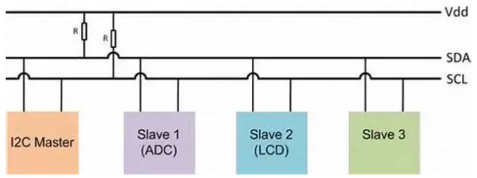 跟SPI对比,I2C没有天生的主、从之分,也就是说挂在两根线(数据线SDA和时钟线SCL)上的所有器件都是生而平等的。数据线SDA和时钟线SCL需要上拉电阻。