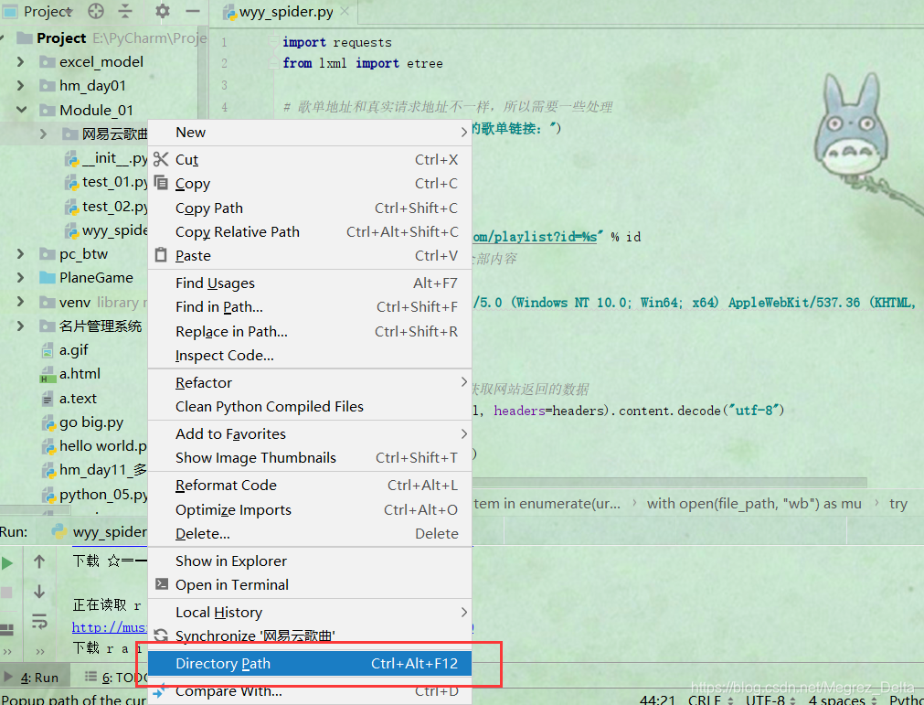代码:for index, item in enumerate(url_music): url_id = item.split("=")[-1] file_name = name[index] # print(url_id, file_name) print("正在读取 %s.mp3" % file_name) # 网易云外链 http://music.163.com/song/media/outer/url?id= music_base = "http://music.163.com/song/media/outer/url?id=%s" % url_id print(music_base) # 加r防止字符转义 file_path = r"E:\PyCharm\Project\Module_01\网易云歌曲/%s.mp3" % file_name -