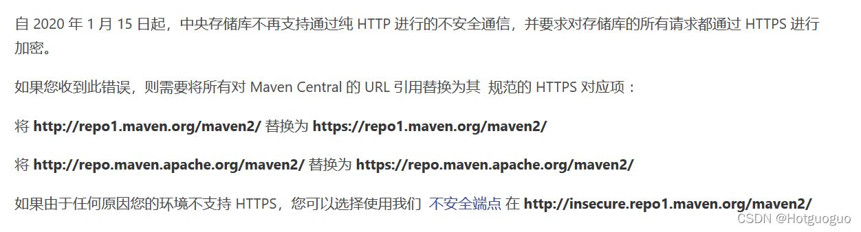 自 2020 年 1 月 15 日起,中央存储库不再支持通过纯 HTTP 进行的不安全通信,并要求对存储库的所有请求都通过 HTTPS 进行加密。