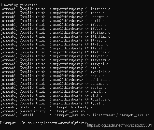 打开cmd,进入Viewer目录(不是JNI目录也不是上一级,切记),执行ndk-build ,静等几分钟,大功告成。