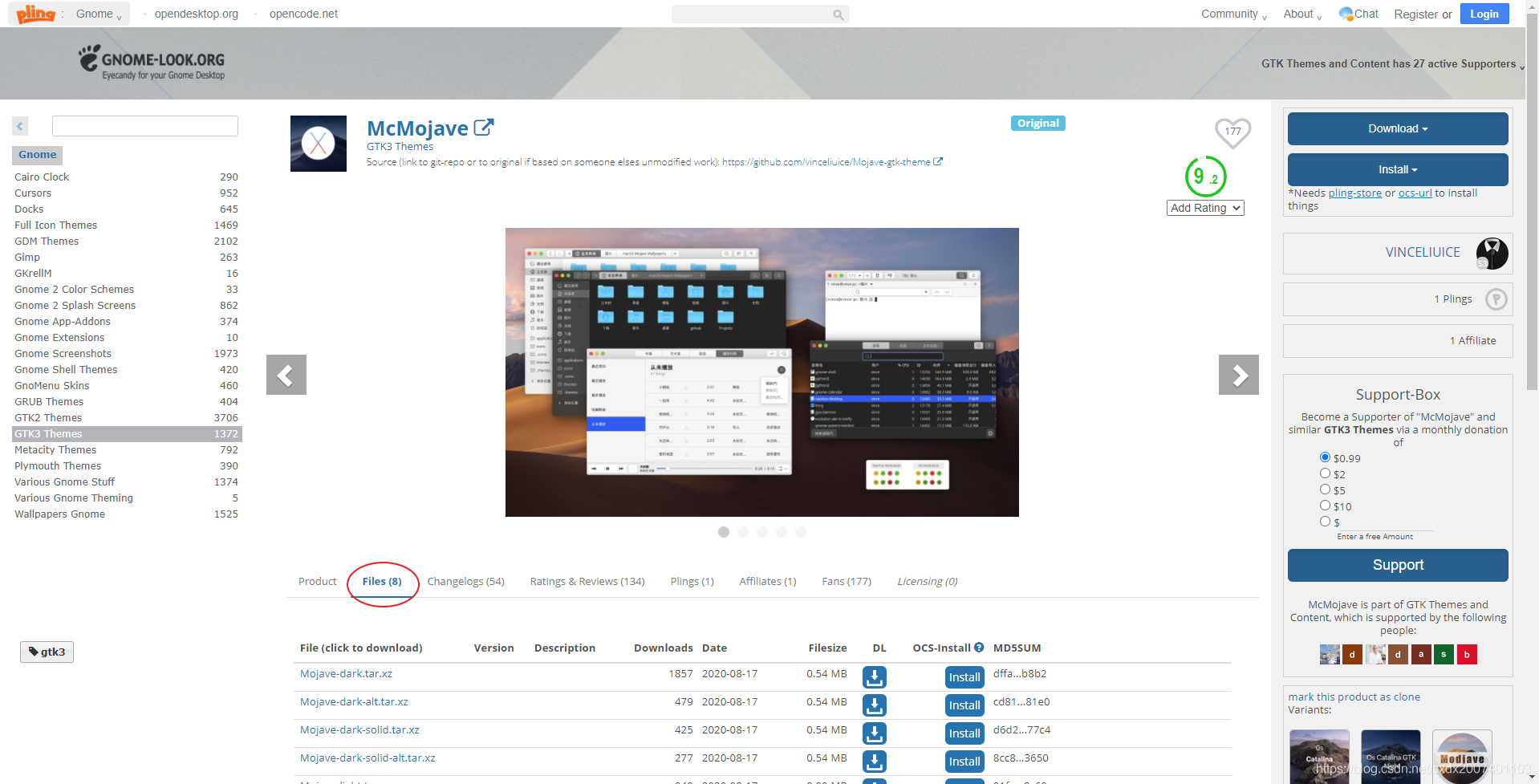 ,点击files选择要下载的主题,我选择了下载最多的那个 Mojava-dark.tar.xz。下载有点慢,稍等即可。