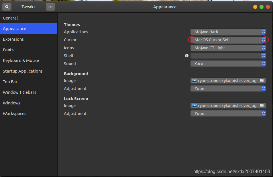 在Tweaks中Appearance(我的是英文版,请自行对照)中Cursor选择该该游标集: