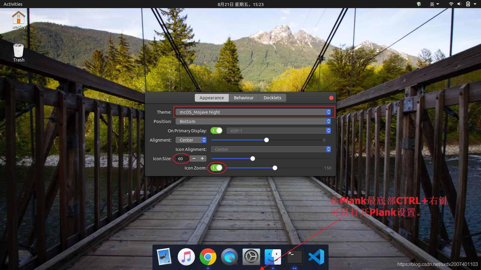 此时在鼠标在plank最底部,点击ctrl+鼠标右键可以打开plank设置,自定义刚才拷贝进去的主题包。另外我设置了Icon Size(图标尺寸)和Icon Zoom(变大)。