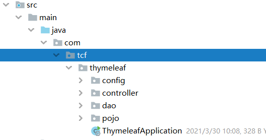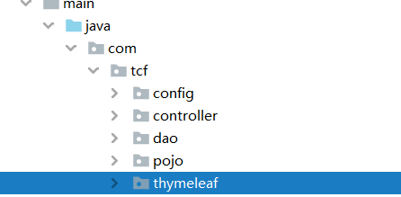 2. 我们的习惯就是在tcf包下建其他的包,如controller,pojo等,因为是Springboot,我们必须在thymeleaf包新建 controller,pojo等包,因为我的thymeleaf包下是默认的存放Application启动类的,放在tcf包下,不能被扫描到,所以会出现 404错误!!!