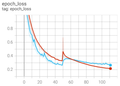 如上图所示,如我们预期,Loss在50epoch时由于换了loss function而发生了突变,接着继续训练。