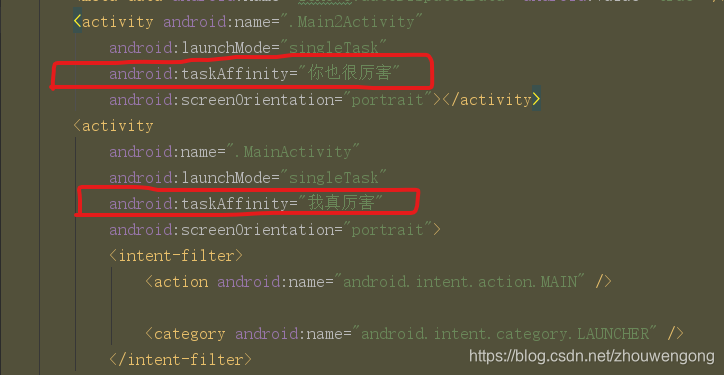 - taskAffinity表示当前activity具有亲和力的一个任务(翻译不是很准确,原句为The task that the activity has an affinity for.),大致可以这样理解,这个 taskAffinity表示一个任务,这个任务就是当前activity所在的任务。