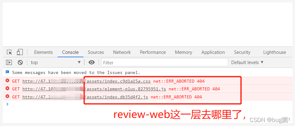 文件不都在么,怎么回事啊???再仔细观察,review-web这一层目录竟然不存在,这也就是404的缘故了。看到这里,你们知道究竟是咋回事么?而且检查发现,看到assets竟然跟review-web同级?离谱!狗看了都摇头。