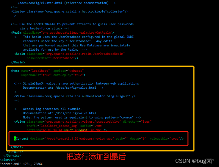 说明:docBase为你webapps里头的dist文件夹,我是将改名为review-web了,所以路径是到写review-web即可,你改名为啥就写啥。