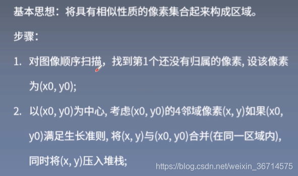 区域生长:是一种串行区域分割的方法。从某个像素出发,按照一定的准则,逐步加入邻近像素。当满足一定的条件的时候,区域停止生长。