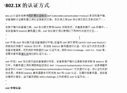 802.1X协议采用EAP(ExtensibleAuthenticationProtocol,可扩展认证协议)来实现客户端、认证系统和认证服务器之间认证信息的交互。通过支持EAP协议,可以使用认证服务器来实现各种认证机制,认证系统仅仅需要传送认证信息,并根据认证返回的结果控制受控端口的状态。