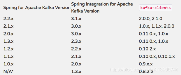 Apache Kafka的Spring基于纯java kafka-clients jar。兼容matrix如下