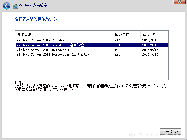 1、在PC安装Windows 2019。安装时选择标准版带桌面体验