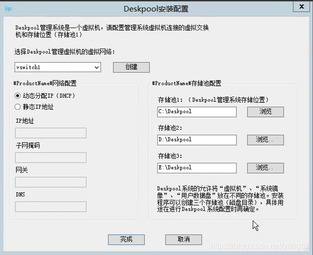 执行安装程序,注意选择 虚拟交换机地址,存储池的目录。