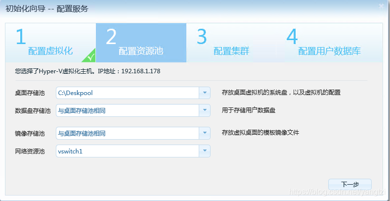 在配置资源池阶段,桌面虚拟机、数据盘 和 模板镜像保存在 SSD 盘(C:\Deskpool)。