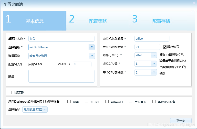 选择模板为【win7x86base】,设置虚拟机前缀为 office,后缀为01,顺序编号。配置内存2048MB,CPU为2核心。