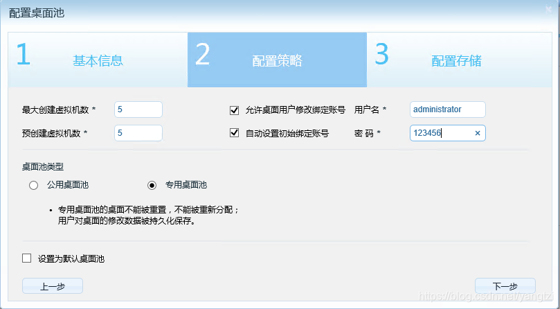 设置最大创建5个用户。设置绑定账号。设置桌面池类型为专用桌面,以满足办公需求。 这里的绑定账号是模板的Windows 用户账号(administrator   123456)。 终端登录桌面云时,实际需要经过两次认证,一次是Deskpool系统的用户账号认证。一次是Windows的用户账号认证。这里的绑定账号功能可以让终端自动进行Windows用户账号的认证,避免再次输入windows账号。该功能仅仅对云终端或者DeskpoolClient 有效。