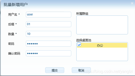 在用户菜单中批量增加用户 user01 ~ user10, 用户签约桌面池【办公】。