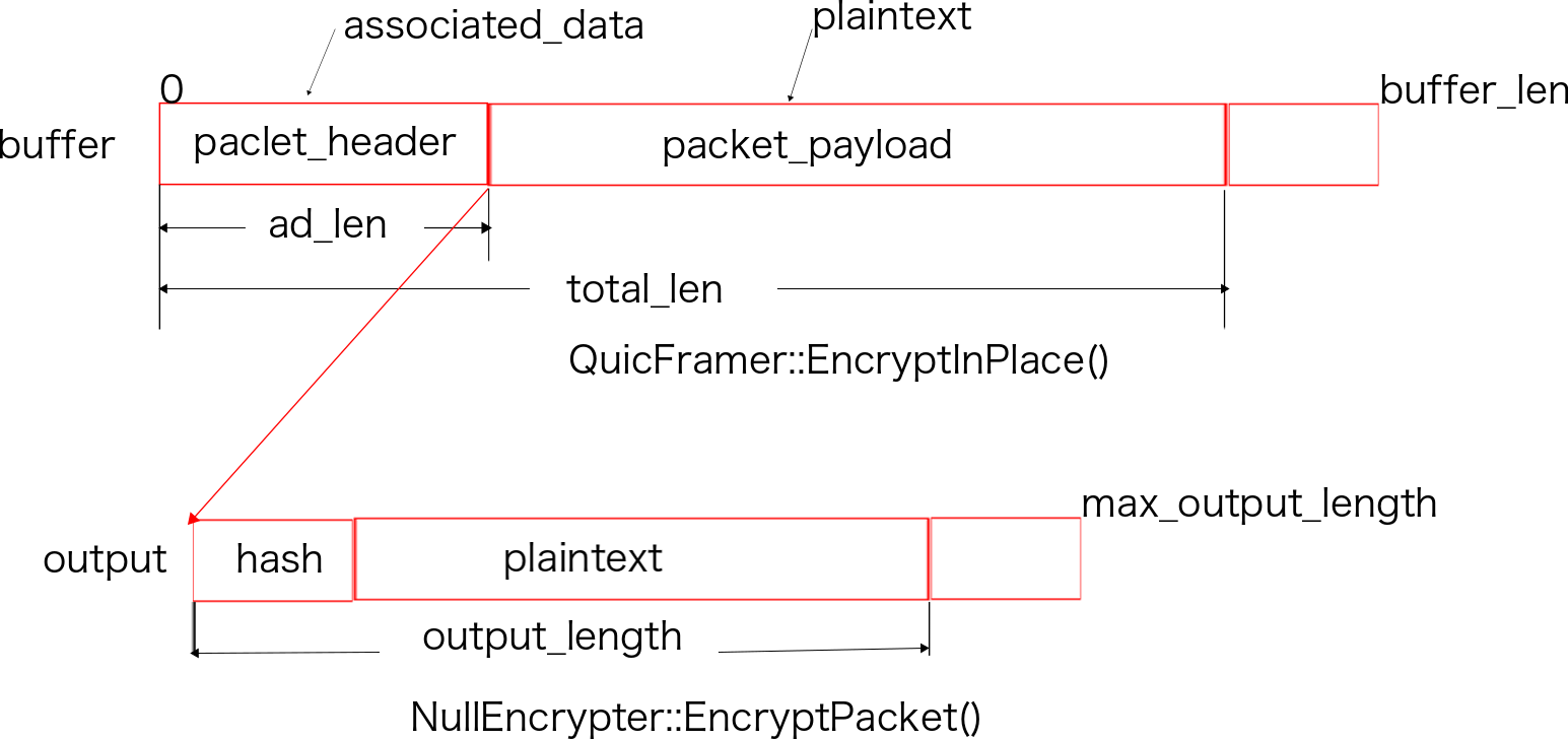 然后是对 payload 加密,加密过程设计到的两个函数 QuicFramer::EncryptInPlace() 和 NullEncrypter::EncryptPacket() 中相应参数如下图所示: