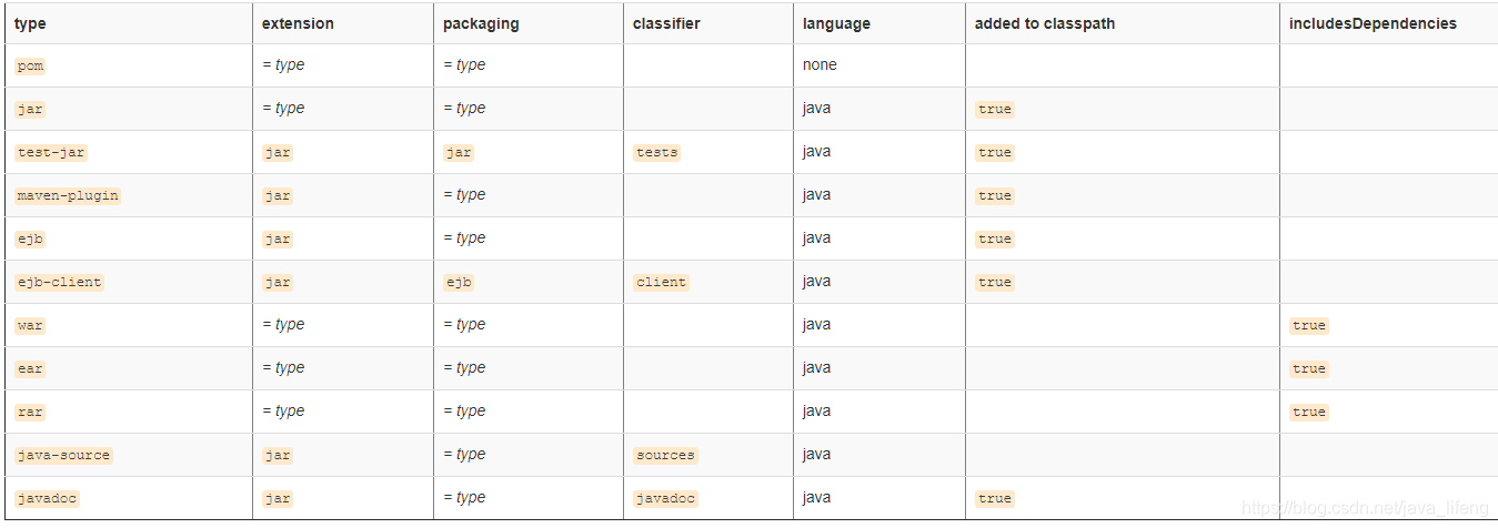 依赖的类型,通常但并不总是代表依赖文件的扩展名。类型可以映射到不同的扩展名和分类器,类型通常与所使用的包装方式相对应,但也不都是如此。<packaging>xxx</packaging>。常见的有 jar, war, ejb-client, test-jar等等 。另,type的默认值为jar。以下是官网列出的一些默认处理方式列表,但这不是全部。