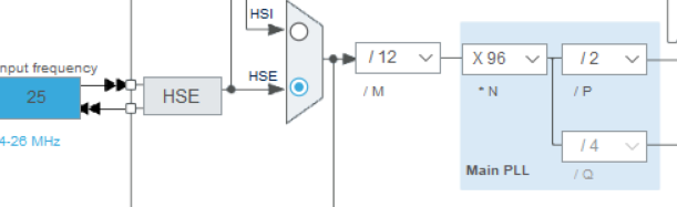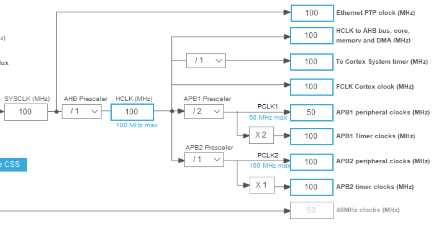 F4系列芯片的最高频率分为4个等级,84、100、168、180MHz。这块芯片是100MHz的,这个最高频率我们在之后计算定时器的时候还是会用到的,当然我们的芯片也基本会一直以最高频率运行。