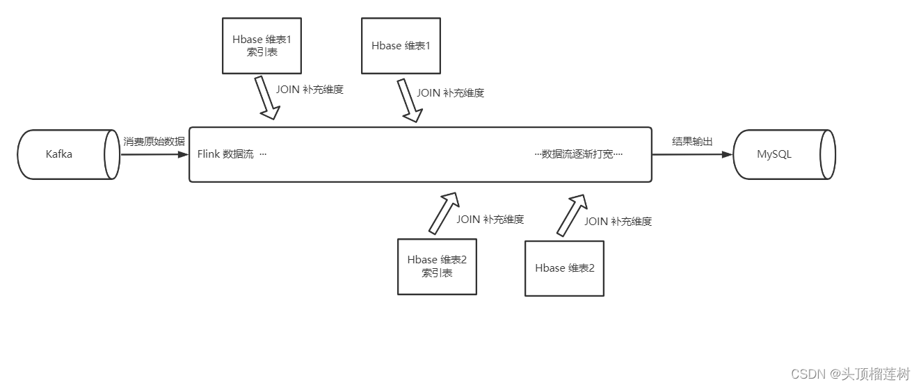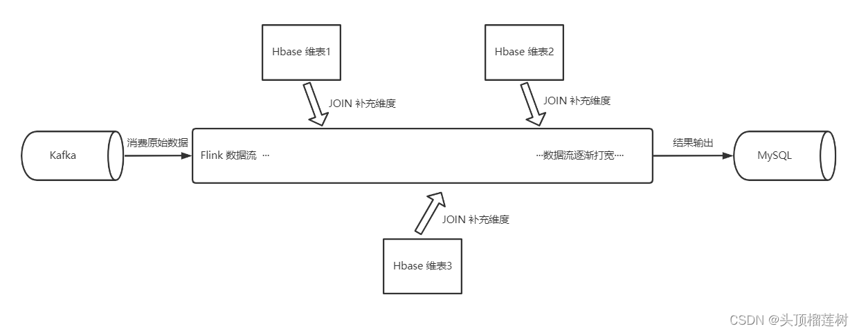 我们在做实时数据开发的时候,通常要用spark、flink去消费kafka的数据,拿到数据流后会和外部数据库(Hbase、MySQL等)进行维表关联来把数据流打宽。当然了,有些外部数据库不只是存储维度数据,也会有很多事实数据,并且这些数据更新频繁,数据量巨大,但是我们的Flink流也会去实时的join这些巨大的事实表,这就需要选择一个合适的外部数据库作为支持,这个外部数据库一定要满足海量数据高效的读写性能,这样才能满足实时场景的需求,说到这,我们的目光自然而然的落到了Hbase上,来吧,我们直接上图,下面这张图就是以上所说场景的一个基本架构