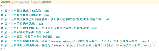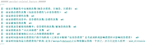 - 特征工程分为5个部分:用户相关特征、商家相关特征、优惠券相关特征、用户-商家联合特征以及数据泄露相关特征。每部分特征工程都需要为训练集和测试集各做一次,这样才能为训练集和测试集构造出相同的特征属性,保证训练集和测试集最后的字段种类是完全相同的(除了目标变量字段)。