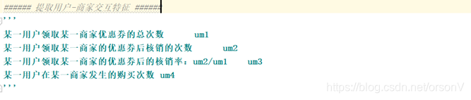 - 用户-商家交互相关特征包括4个特征属性。这一部分特征工程与其他部分最大的区别在于,其结果数据集的主键是两个字段的组合:[user_id, merchant_id]。