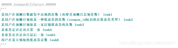 - 图示即leakage相关特征清单,包含6个特征属性。这一部分最难的地方在leak4和leak5的提取,需要用到比较高级的聚合行值函数以及自定义函数。在看详细的代码之前,有必要指出一个数据集处理中的常用思路:需要进行行与行比较的问题(通常无法直接操作)通常转化为列与列比较的问题。实现转化的方法就是行错位,有点类似于数列错位相消的操作。