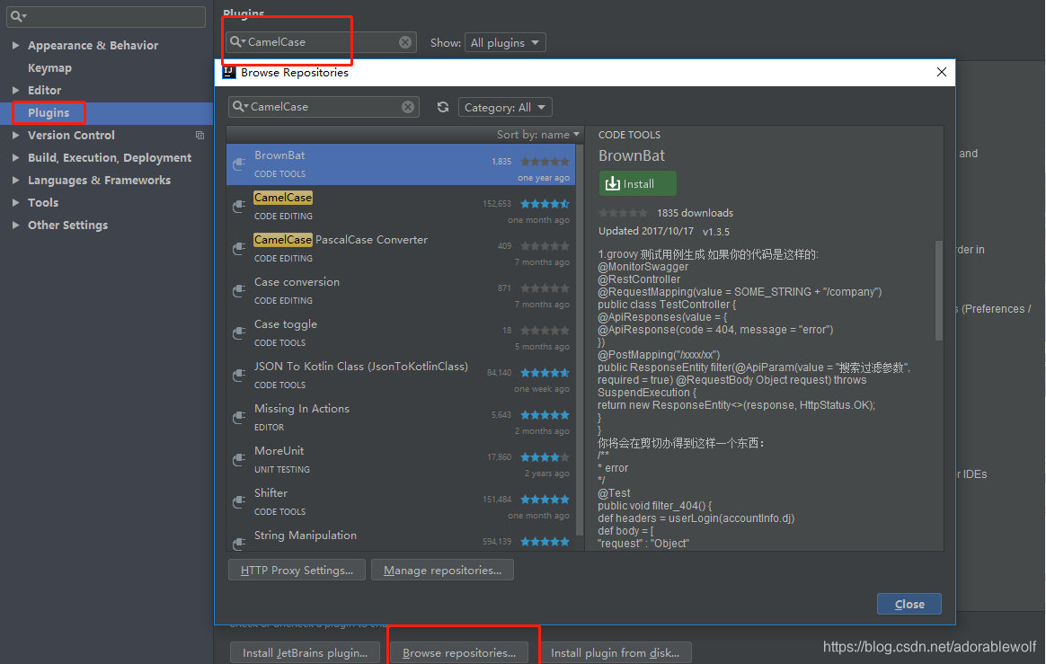 安装过程 crtl+alt+s 点击Plugins 输入 CamelCase 点击Browse repositories