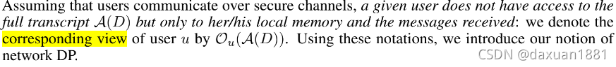 A是去中心算法,两个D就是相邻数据集。提出了一个满足(epsilon ,delta)network DP。NetworkDP是被认为讲操作O和算法A结合起来的一种分析,主要就是希望结合起来的隐私要比单独的A要好(与DP比)。