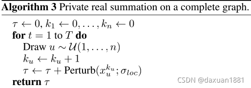 边E从第一个用户u开始walk,范围是u到n-1。Token从用户1开始经过k次。背景:环是公开的。在LDP中,在发送数据给中心之前,需要给每一个single contribution添加随机扰动(标准差standard deviation)。所以在这个求和问题中,也是考虑了一个抽象机制Perturb(x; σ) 去添加噪声(高斯机制或者拉普拉斯)Let
