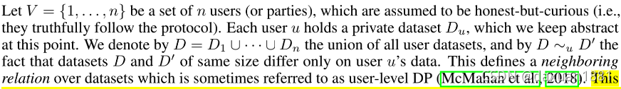 但是又考虑到用户之间的勾结,根据定义1,假设一个一个upper bound上界c,代表用户可能串通的数量。在这种setting下,希望保护聚集的信息Ov’