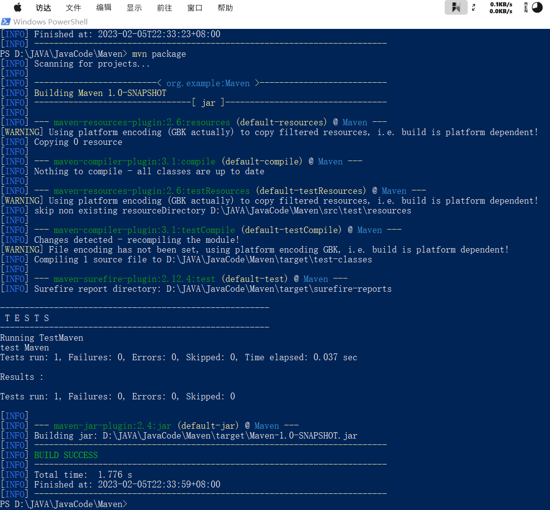 根据Mavne的默认生命周期,执行打包操作的时候会先执行测试操作,所以在打包操作显示的内容中会有显示测试代码展现的结果: