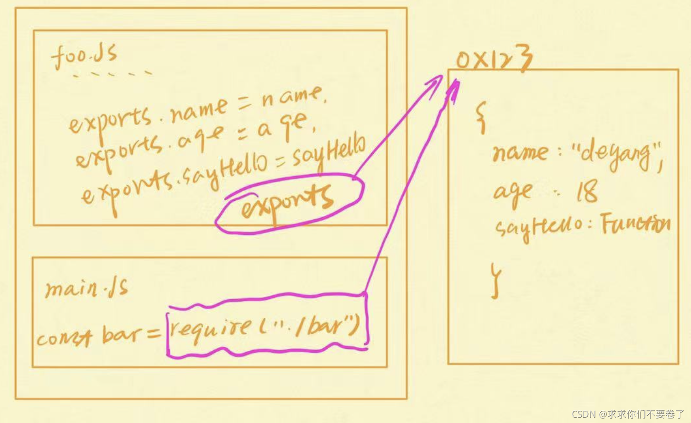 bar.js中的exports对象 和 main中通过require(‘./bar’) 的返回值其实是同一个对象,所以 bar 对象是exports对象的浅拷贝(引用赋值)