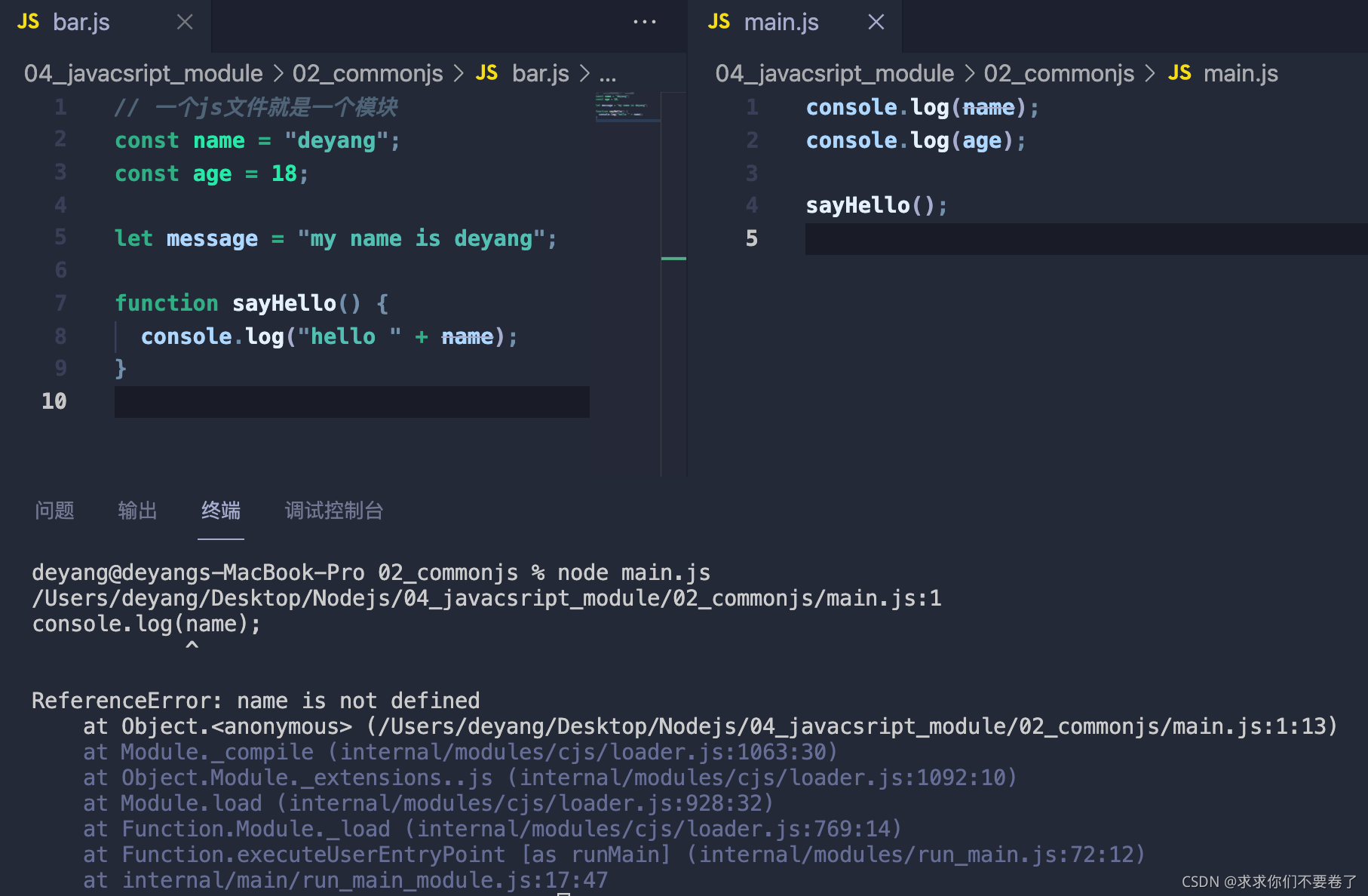 在main.js中想要输出并运行bar.js中的变量和函数,但是在执行的时候首先会因为找不到name这个变量而抛出异常。