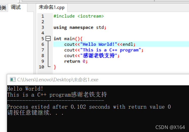 下面就是在有注释的那个地方,我们要来敲我们的第一行代码了,没错,就是每个程序员梦开始的Hello Woeld!我们接下来说一下用C++输出Hello World!